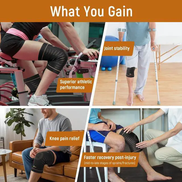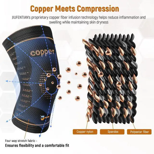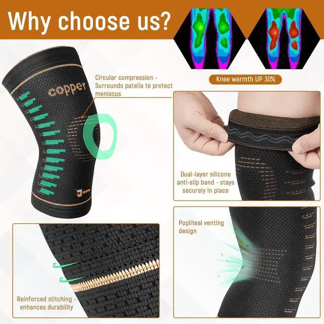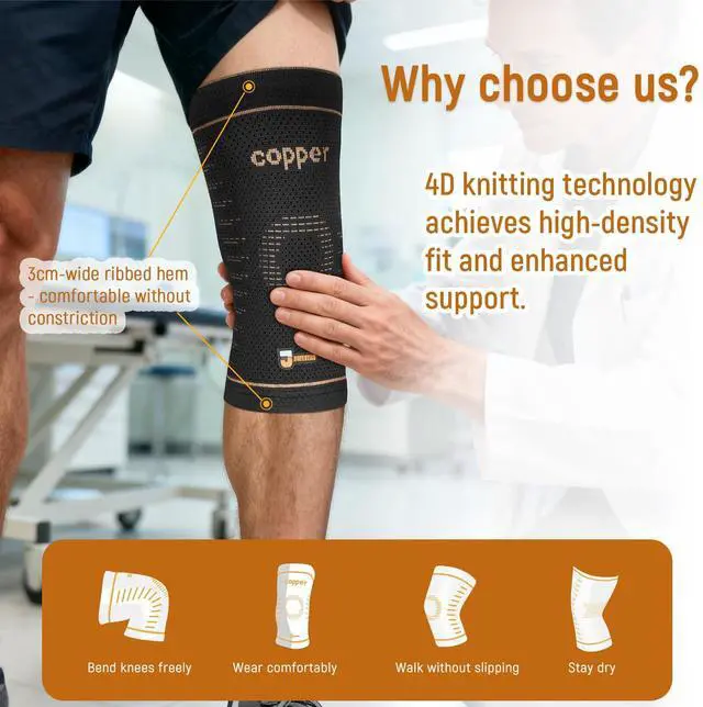Copper-Infused Performance:Engineered with genuine copper-infused nylon, our knee compression sleeves promote blood flow to reduce swelling and lactic acid buildup. Silicone grips ensure slip-free stability during workouts or all-day wear.