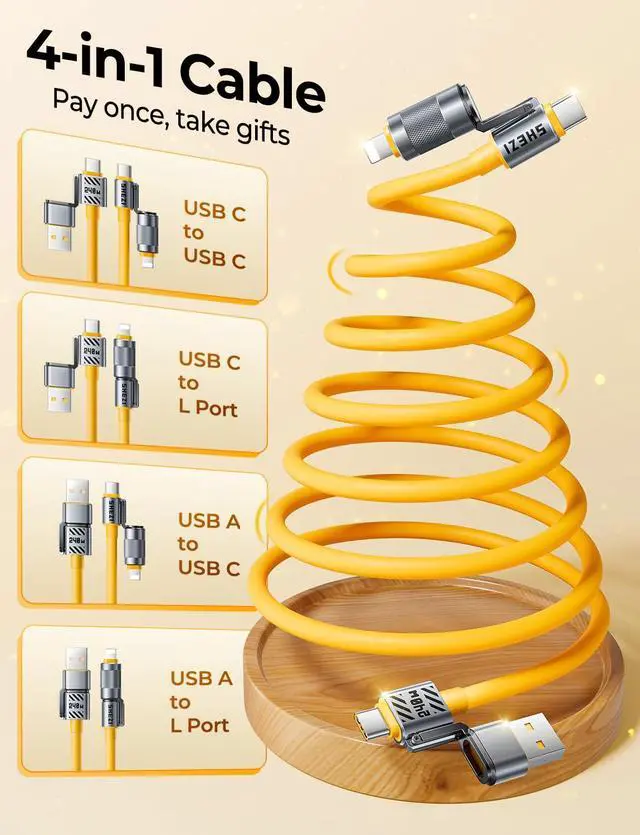 Support CarPlay & Android AutoOur state-of-the-art coiled 4 in 1 charging cable is here to shatter boundaries. Equipped with revolutionary interchangeable ends, it effortlessly bridges a gap between the iPhone and Android users. Seamlessly toggle between USB-C and compatible with Lightning connectors with a simple twist, granting you instant access to the power of CarPlay and Android Auto