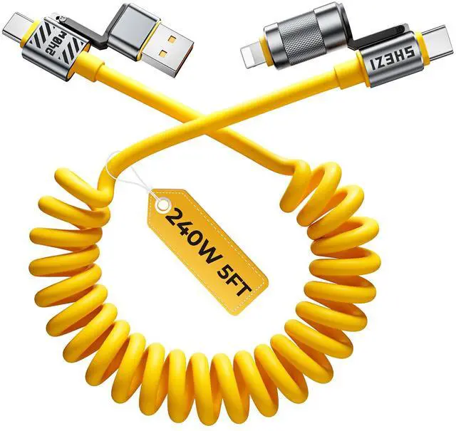 Coiled Cable 4-in-1 USB C Cable 240W Compatible with Lightning Cable Fast Charging & Data Transfer, Support to CarPlay & Android Auto, 5FT Multi Cord Combo Charger for iPhone/iPad
