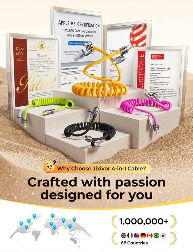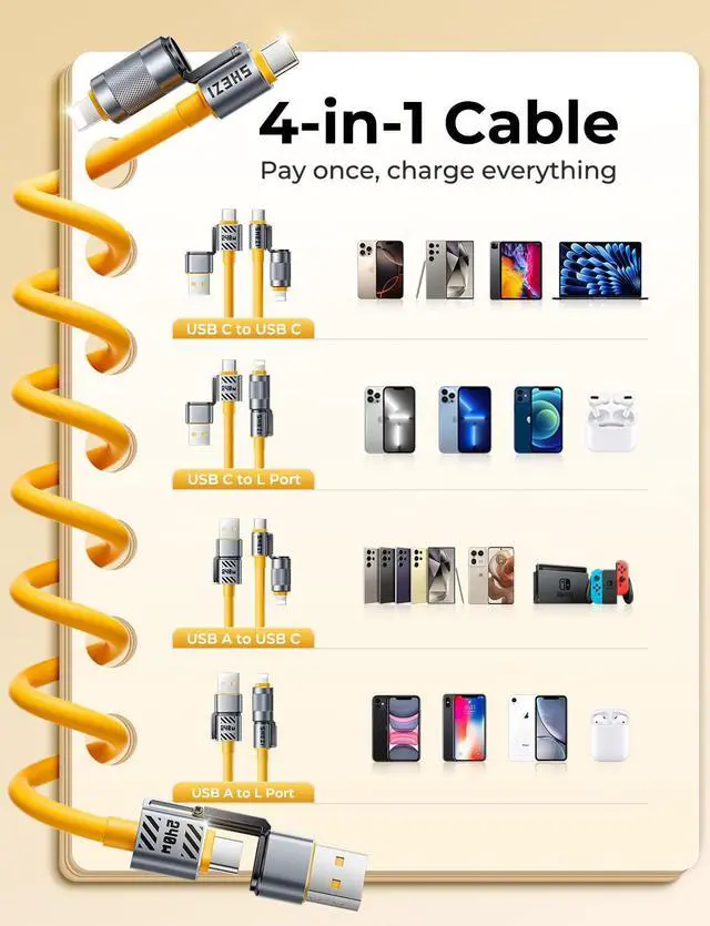 Super Times 4 in 1 Charging Cable: The Jixivor usbc charger cable charging provide 4 different ports combination: [USB C to USB C] [USB C compatible with Lightning] [USB A to USB C] [USB A compatible with Lightning]. Coiled iphone charger fast charging cord Perfect for car travel and business trips. Designed to say goodbye to tangled cable,savailable anytime, anywhere. You will simply be floored by its versatility and ease of use