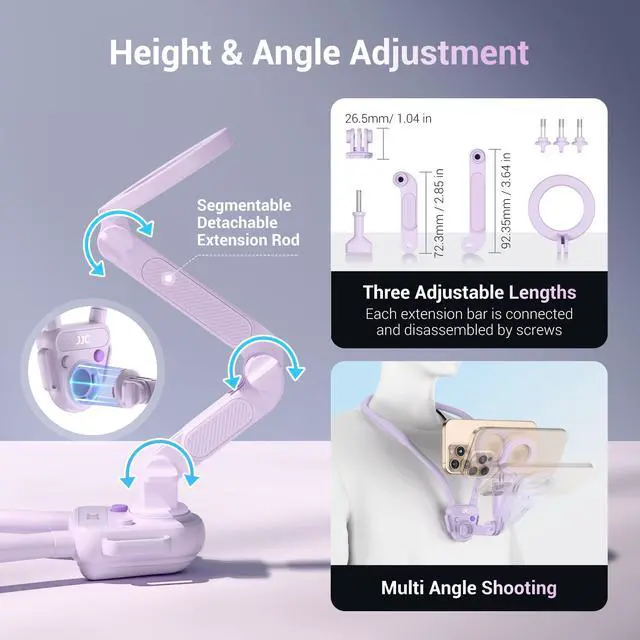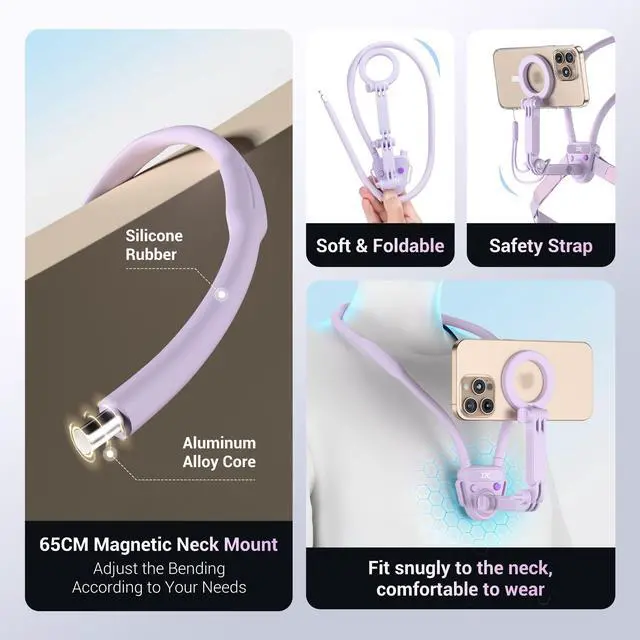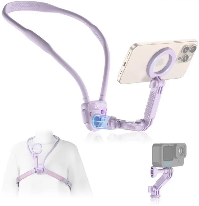 Magnetic Neck Mount for Phone & Action Camera, POV Neck Holder for iPhone 17-12 Series Android Phones Gopro Insta360 with Quick Release & Angles Adjustment for Content Creating Women-Purple
