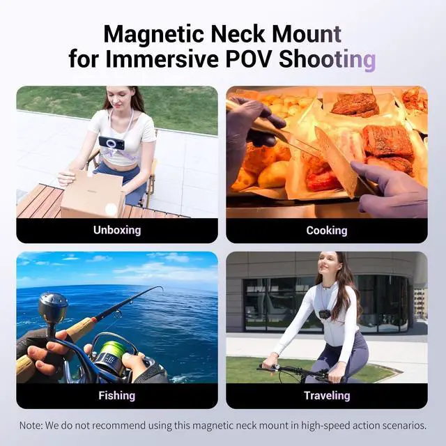 Phone Neck Mount for Point of View (POV)Capture hands-free video from a first-person perspective with the smartphone neck mount. Its an ideal solution for livestreaming and social media content creation, lets you easily wear and mount your phone or action camera for filming. Use it while hiking, biking, doing crafts, and more. Warm Tips: its not recommend to use this magnetic neck mount in high speed action scenarios.