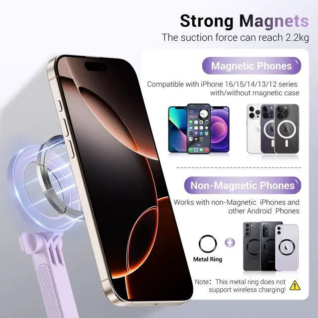 Strong Magnetic AttractionThe neck phone stand offers a quick snap and secure attachment of mounting your phone. With a magnetic force of up to 4.85 lbs (2.2 kg), it firmly holds your phone in place. Easily to switch your phone between horizontal and vertical orientation in seconds.