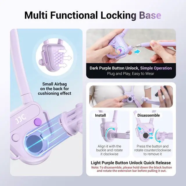 Plug and Play & Secure LockingThe POV neck mount features two function buttons. The RED button can release the neck strap for effortless wearing. Simply press the BLACK button to unlock your device and rotate every 90°to get firmly locked with its strong magnetic mechanism.