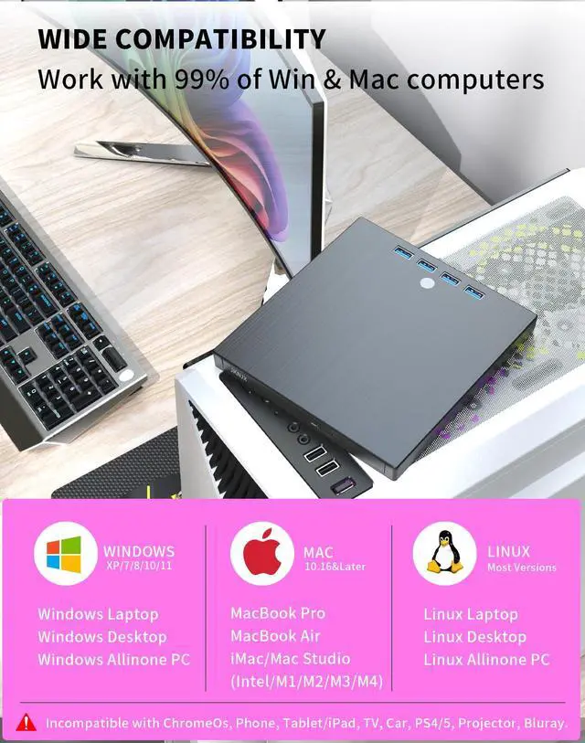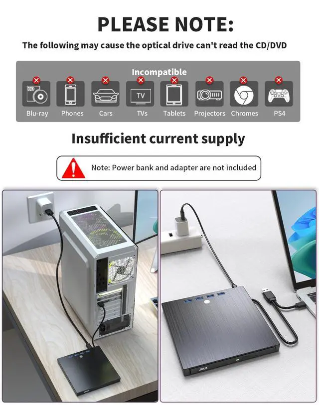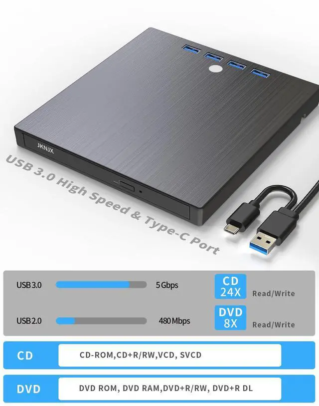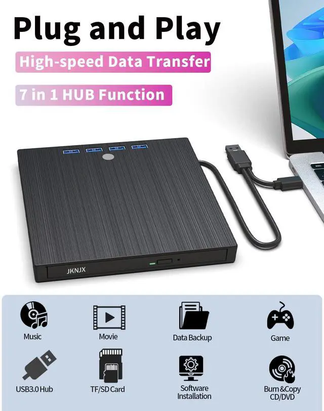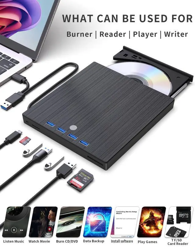 Plug & Play Multifunctional CD/DVD Drive for Laptop: Ideal for those who need a reliable external CD/DVD drive for reading and writing discs, this highly functional 8-in-1 device also offers extra ports to connect other peripherals. No complicated setup requiredjust plug the integrated data cable (conveniently stored underneath) into your laptop, and its ready to use. Insert your disc and use your preferred software to player, burner, reader, writer,or backup content.