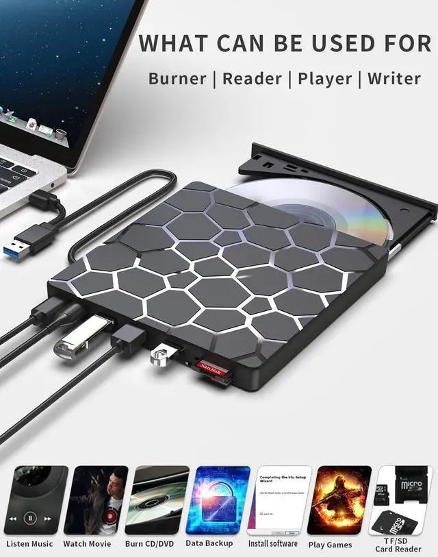 External DVD Drive,8 in 1 Multi-Functional USB 3.0 and Type-C CD Burner Player USB 3.0 with 4 USB Ports and 2 TF/SD Card Slots,Portable Slim Optical Disk Drive for Laptop Mac PC Windows Linux OS