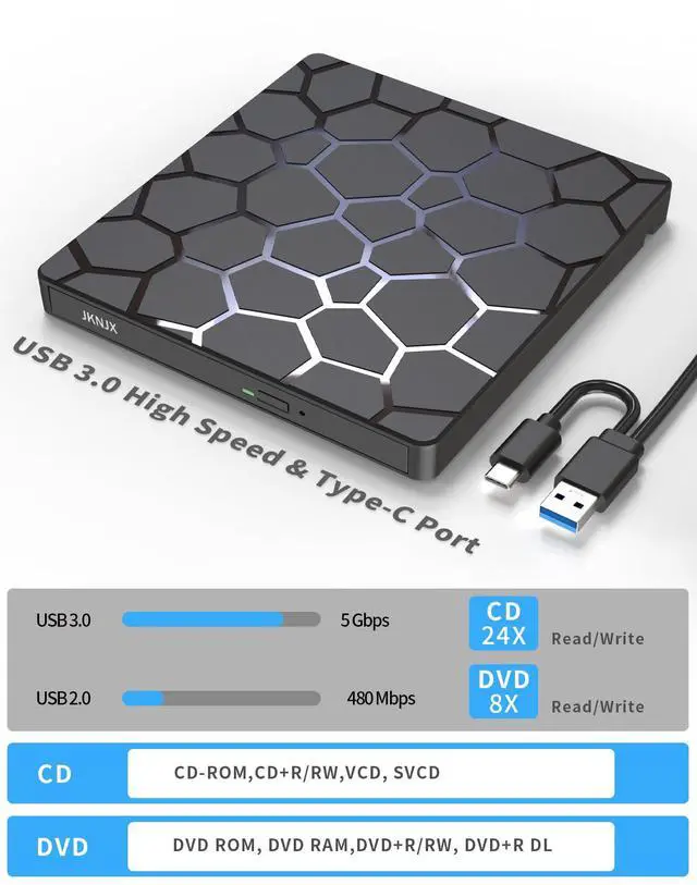 - USB 3.0 High Speed Data Transfer: CD Burner with high speed USB 3.0 and Type-C technology, many of the port cluster connectors backward compatible with USB 2.0 / 1.1. Experience rapid data transfers with advanced USB 3.0 technology, which is approximately 10 times faster than USB 2.(rates up to 5 Gigabits/S 625MB/S),Brand-new loader with strong error correction, low powerconsumption,and high speed.Besids that,The portable CD DVD player supports writing speeds up to 24x for CDs and reading speeds up to 8x for DVDs, ensuring efficient, smooth and stable operation,faster than you expected.