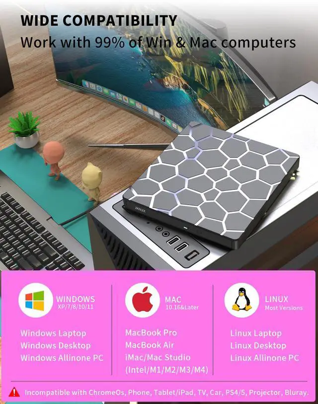 - Broad System Compatibility: This USB external CD/DVD drive offers extensive compatibility, working seamlessly with Windows 11, 10, 8.1, 7, Vista, XP, 2000, ME, and 98, alongside most Linux distributions. It supports laptops, desktops, and all-in-one PCs from leading brands including HP, Dell, Lenovo (ThinkPad), ASUS, LG, Samsung, and Microsoft. It is also fully compatible with Apple MacBook Pro, MacBook Air, iMac, and Mac mini/Studio running macOS 10.16 or later. For optimal power stability with desktop computers, connect directly to a rear USB port. Note: Not compatible with ChromeOS (Chromebooks), iPads/tablets, TVs,vehicles (cars/trucks),some Surface models, or Blu-ray/4K discs.