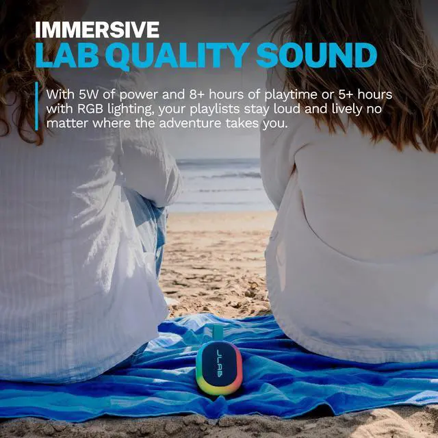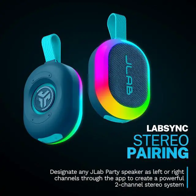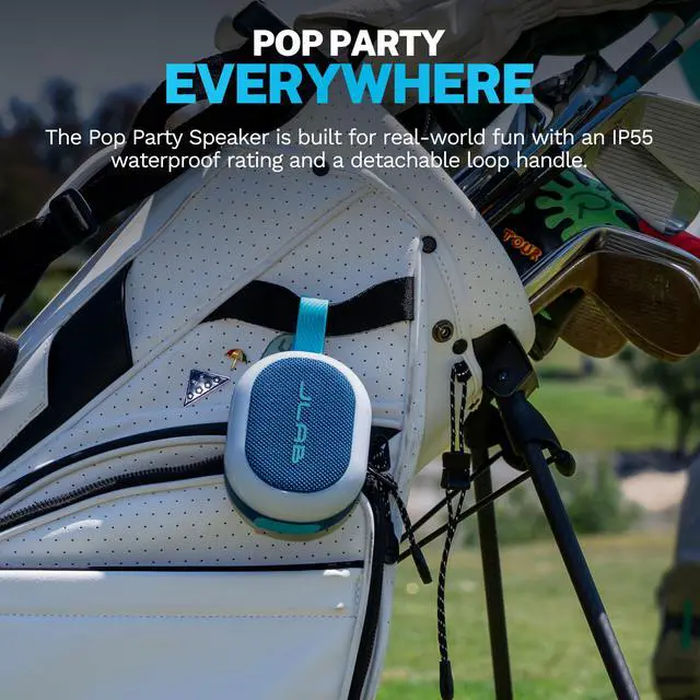 Pop. Play. Party! Designed for ultimate portability, the Pop Party Speaker cranks up the fun anytime, anywhere. With a detachable loop handle, its made for seamless portability and quick setup. Its compact design is perfect for any adventure, while vibrant RGB lighting sets the perfect vibe. IP55 waterproofing ensures the party continues, rain or shine, and the JLab app gives you full control over sound and lighting. Plus, with LabSync, you can connect up to 100 speakers for an unforgettable experience.