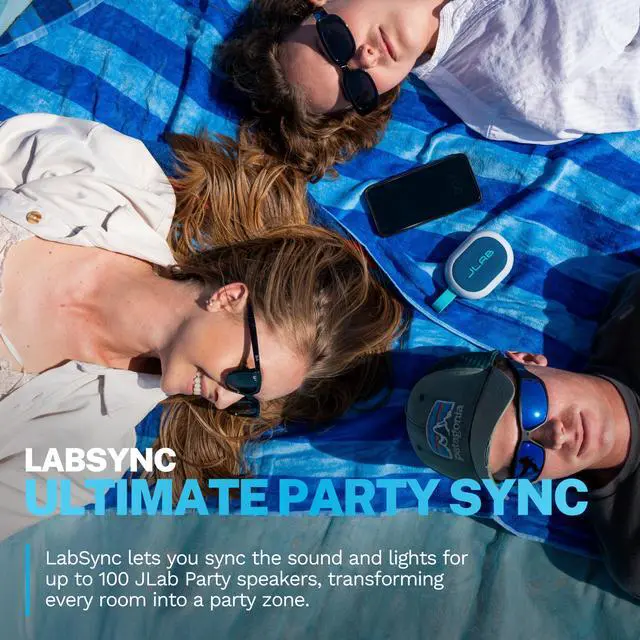 Ready to turn your home into a sonic playground? LabSync lets you sync the sound and lights for up to 100 JLab Party speakers, transforming every room into a party zone. Imagine a symphony of sound, perfectly synchronized, filling your home with electrifying beats. No more missing a moment, no matter where you are. With LabSync, your party knows no bounds.