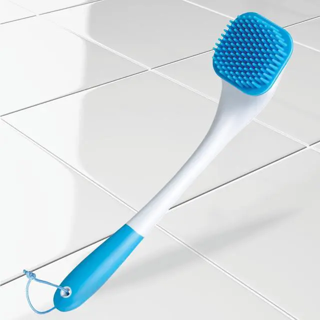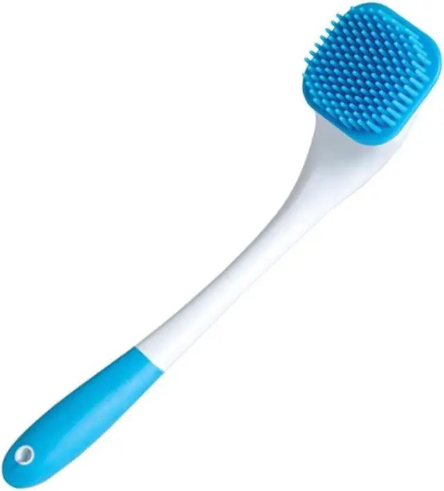 The massage head's smooth rolling stainless balls will ease stress and pain. This silicone bath brush has more than 130 soft it gently exfoliates as it helps promote circulation for clean healthy skin. 16in L back scrubber brush features an easy care removable head and massaging bristles that feel great on your skin. a rubberized comfort grip handle with a built in lanyard for hanging.