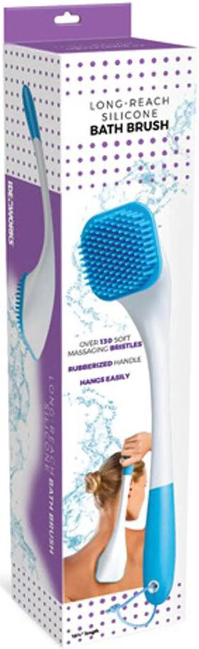 Sft glowing skin is within reach Long reach soft silicone bath brush massages as it scrubs hard to reach areas such as your back legs and feet. Long-Reach bath set pampers you from top to toe without straining or reaching. Three interchangeable heads fit on a 16in L comfort grip handle. The brush head's flexible silicone bristles are gentle to the touch. Fill the applicator head with your favorite lotion and just roll it across your skin for a spa like experience. The massage head's smooth rolling stainless balls will ease stress and pain.