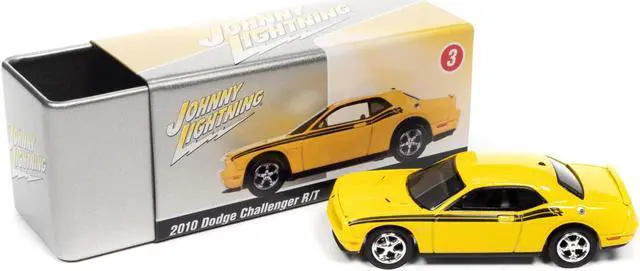 Brand new 1/64 scale diecast car model of 2010 Dodge Challenger R/T Detonator Yellow with Black Stripes and Collector Tin Limited Edition to 5036 pieces Worldwide die cast model car by Johnny Lightning.