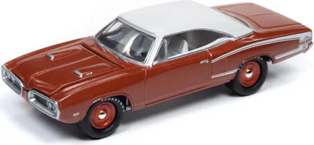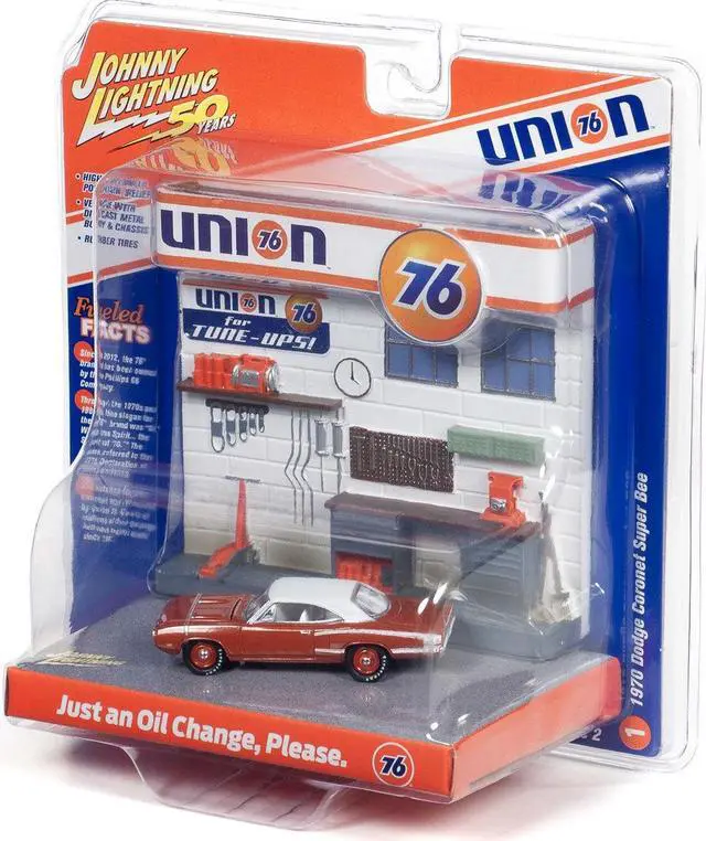 Brand new 1/64 scale diecast car model of 1970 Dodge Coronet Super Bee Brown with White Top and "Union 76" Interior Service Gas Station Facade Diorama Set "Johnny Lightning 50th Anniversary" die cast model car by Johnny Lightning.
