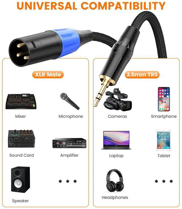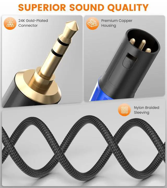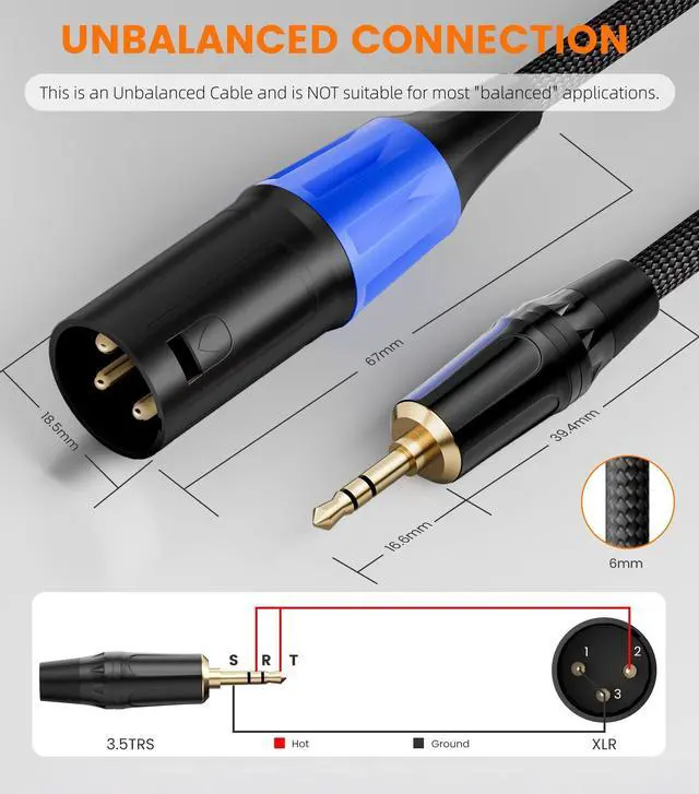 Heavy duty flexible rubber and nylon braid jacket protect the XLR to 3.5mm Cable, the outer diameter of the cable is 6.0mm(0.24 inch), High quality, Polyethylene insulation improves high-frequency response, robust, flexible.
