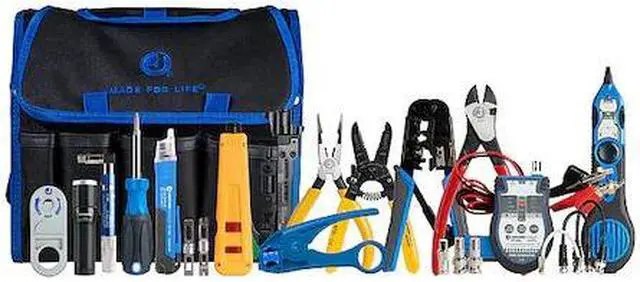 California Proposition 65: This product contains a chemical known to the State of California to cause birth defects or other reproductive harm. Communications Tool Kit, Tool Storage Type Tool Bag, Measurement Type SAE, Drive Size Sockets Not Included, Number of Pieces 13, Pliers Included (1) Diagonal-Cutting Pliers, (1) Long-Nose Pliers, Screwdrivers, Keys, and Bits Included (1) Multi-Bit Screwdriver, Sockets, Drive Tools, and Accessories Included None, Wrenches Included None, Striking and Struck Tools Included None, Cutting Tools Included None, Plumbing Tools Included None