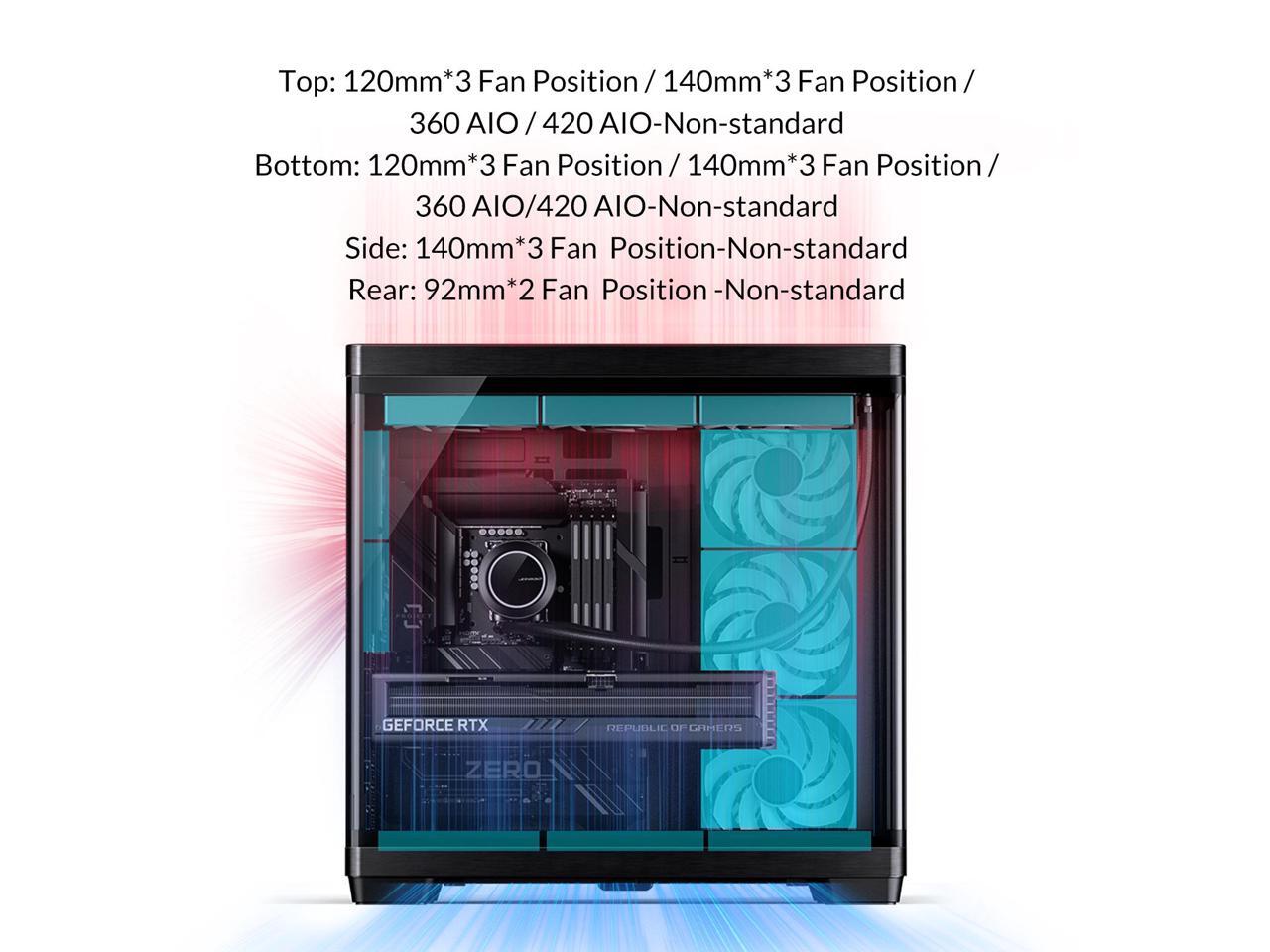 - With 9 fan positions, Dual 420 AIO mounting positions