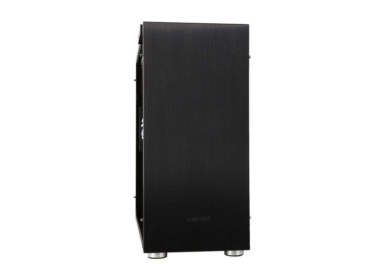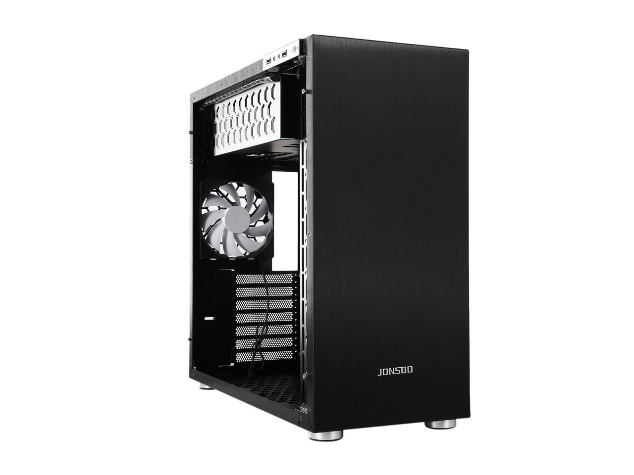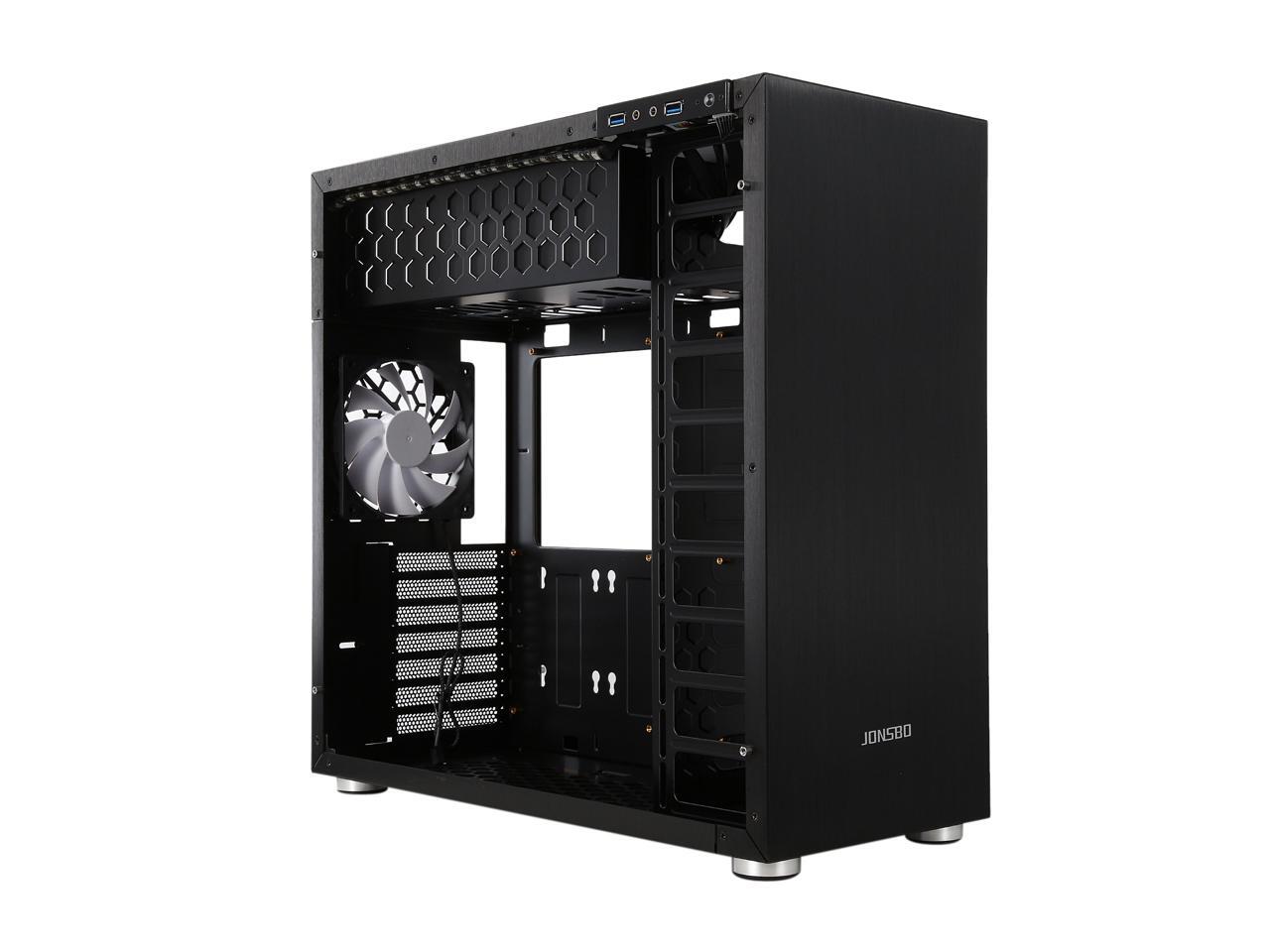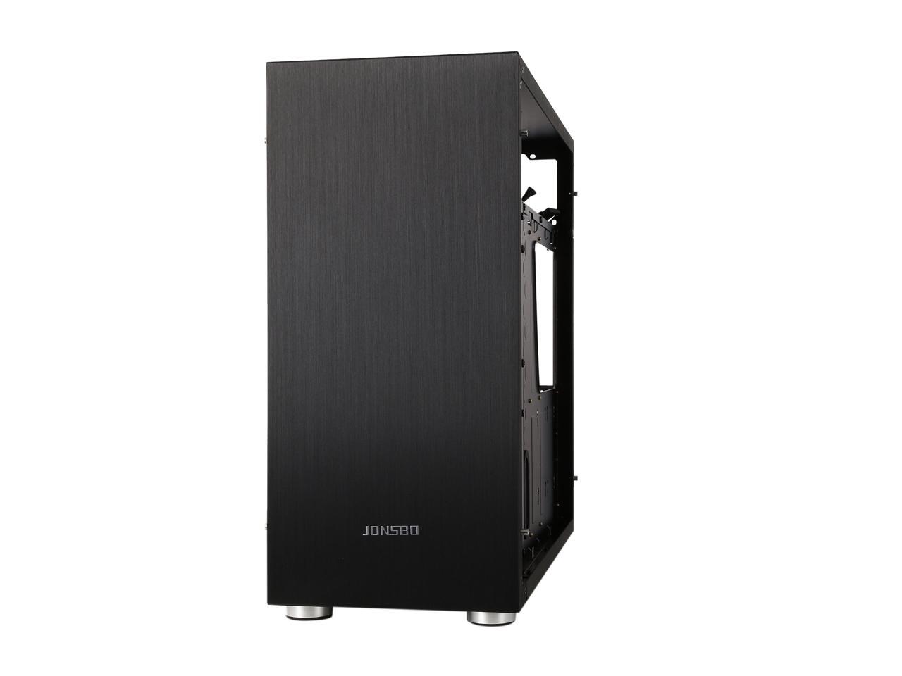 The mid-tower Jonsbo C4 catches eyes at the first sight, featuring clean front panel design, all black interior, and tempered glass panels on both side. Its interior provides adequate space to support ATX motherboard, CPU cooler up to 167mm in height, VGA card up to 300mm long, and up to seven expansion cards. In terms of cooling, the C4 supports three 120mm intake fans at front left side (behind the left glass panel), two 120 intake fans at the bottom, and one 120 rear exhaust fan (included), and features six precision cuts on the right glass panel to ensure advanced air circulation. Water cooling radiator can also be installed. The power button, two USB 3.0 ports and two audio jacks are located at the top of the left panel for easy access, as well as preserving the clean look of the front panel.