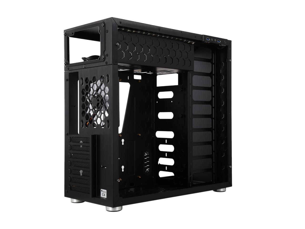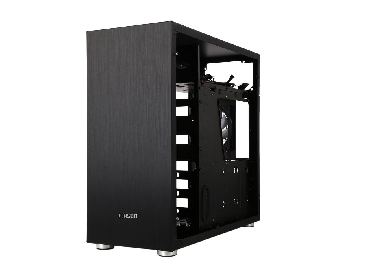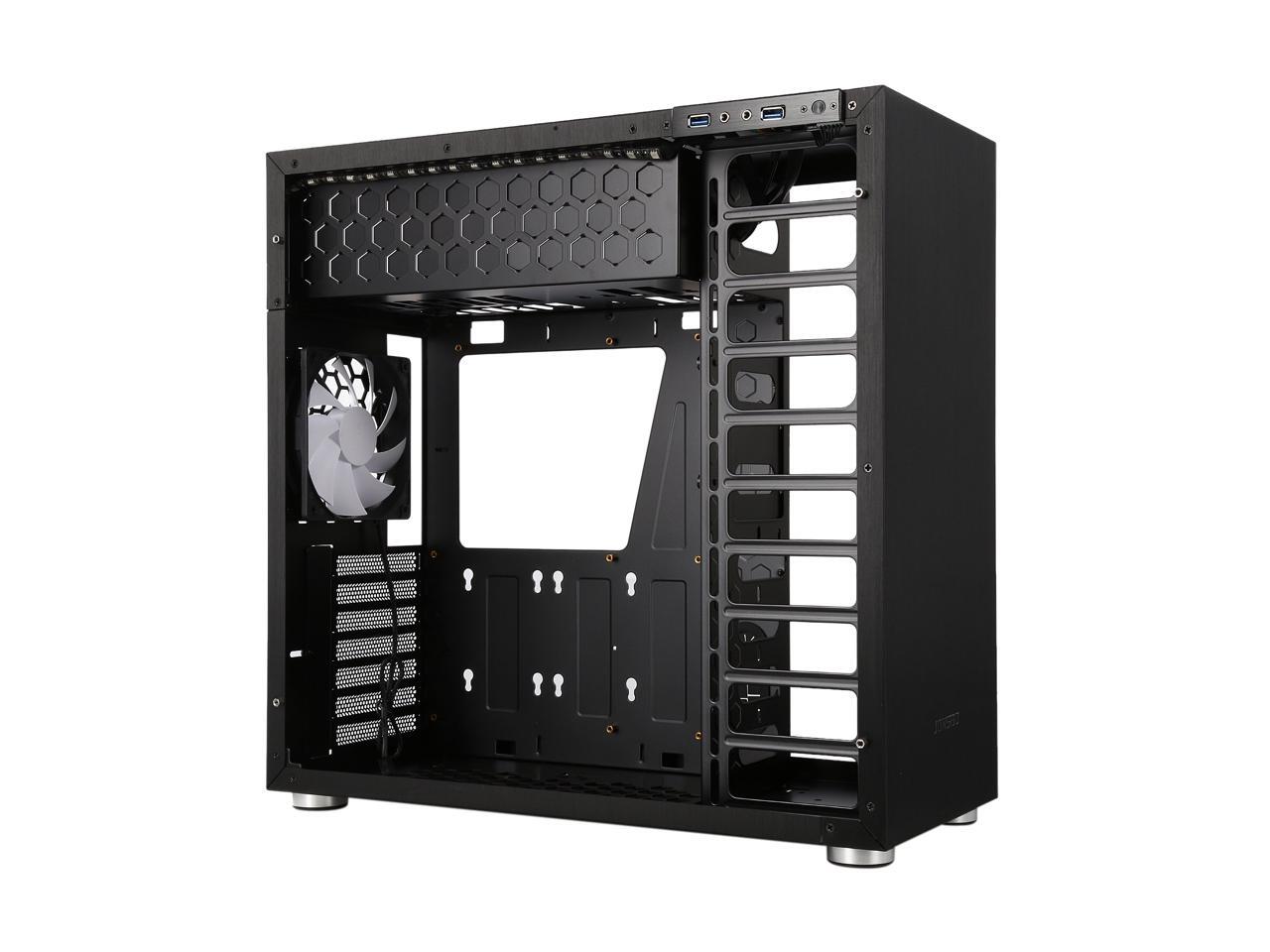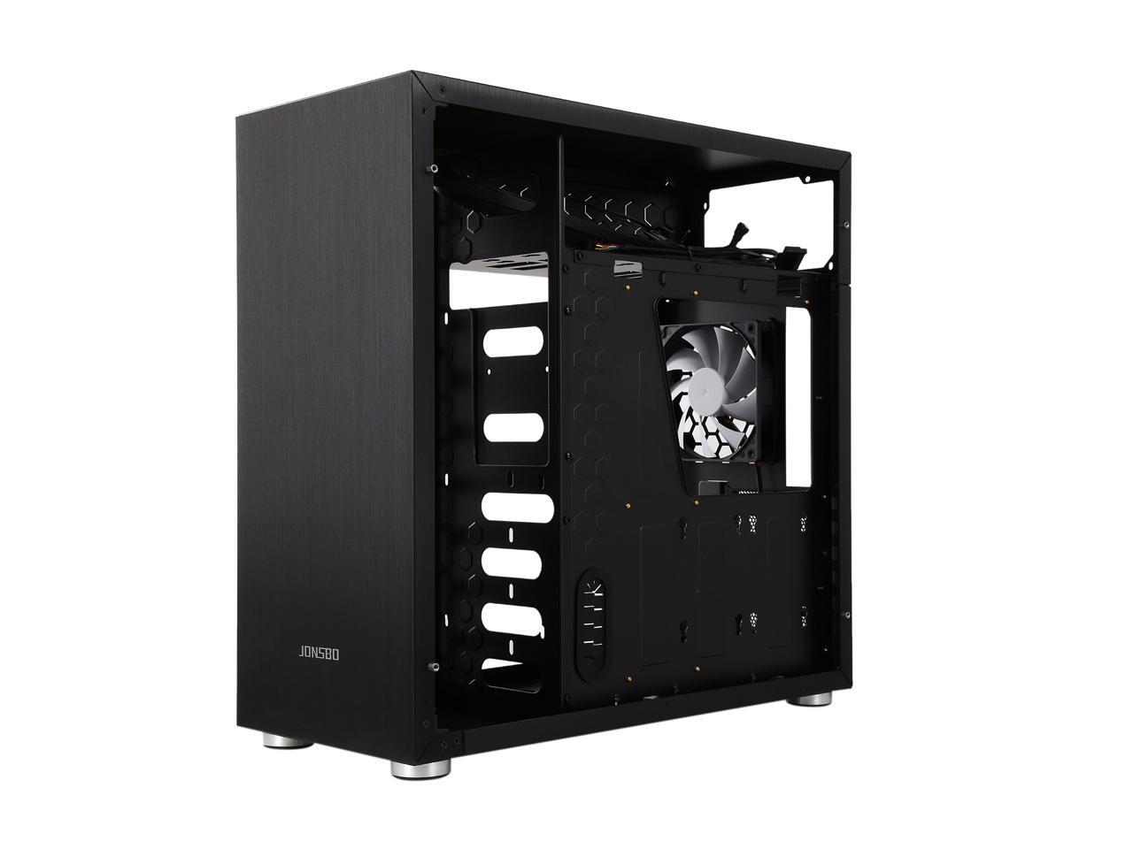 The mid-tower Jonsbo C4 catches eyes at the first sight, featuring clean front panel design, all black interior, and tempered glass panels on both side. Its interior provides adequate space to support ATX motherboard, CPU cooler up to 167mm in height, VGA card up to 300mm long, and up to seven expansion cards. In terms of cooling, the C4 supports three 120mm intake fans at front left side (behind the left glass panel), two 120 intake fans at the bottom, and one 120 rear exhaust fan (included), and features six precision cuts on the right glass panel to ensure advanced air circulation. Water cooling radiator can also be installed. The power button, two USB 3.0 ports and two audio jacks are located at the top of the left panel for easy access, as well as preserving the clean look of the front panel.