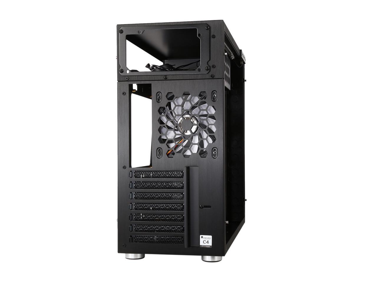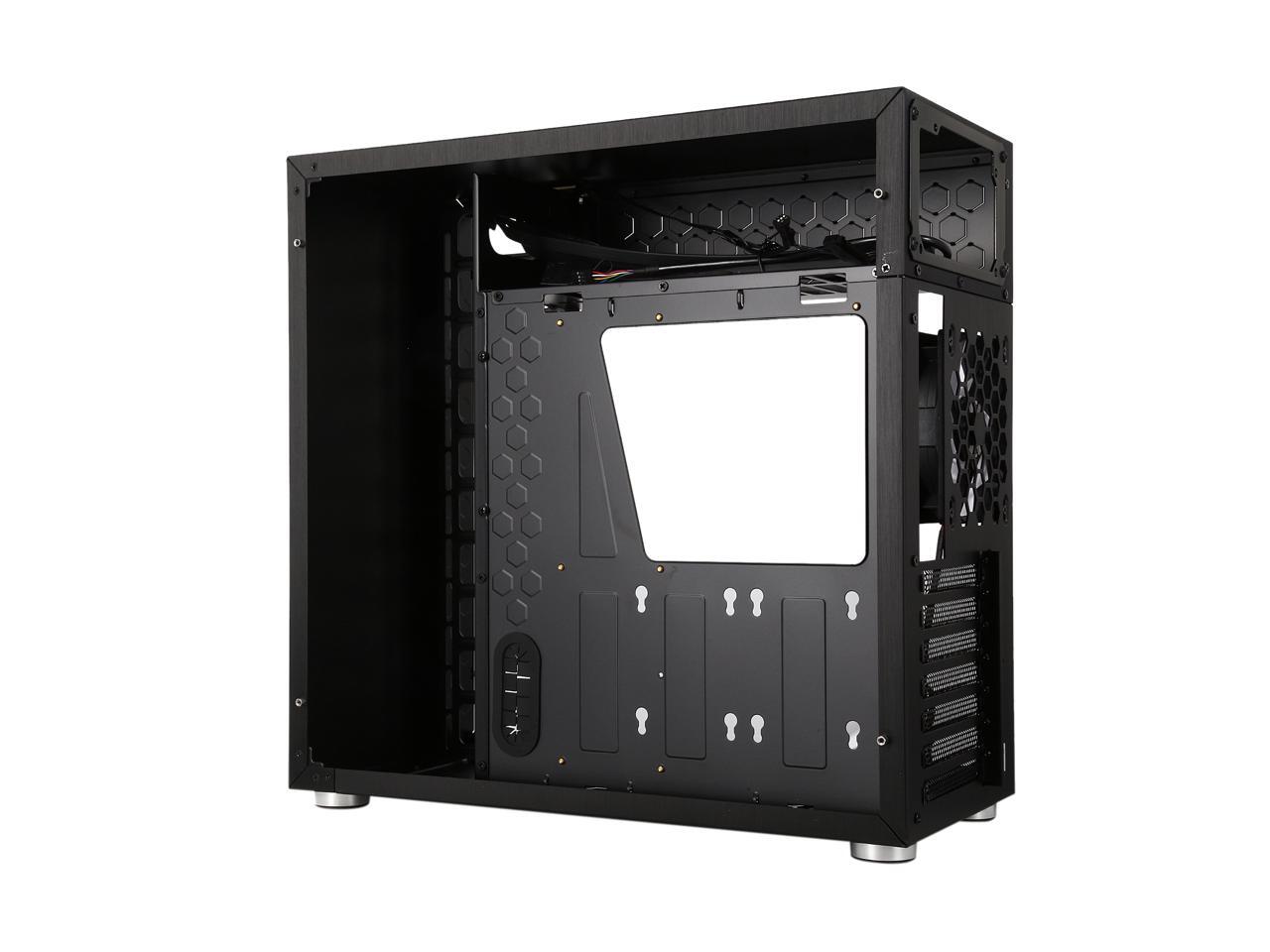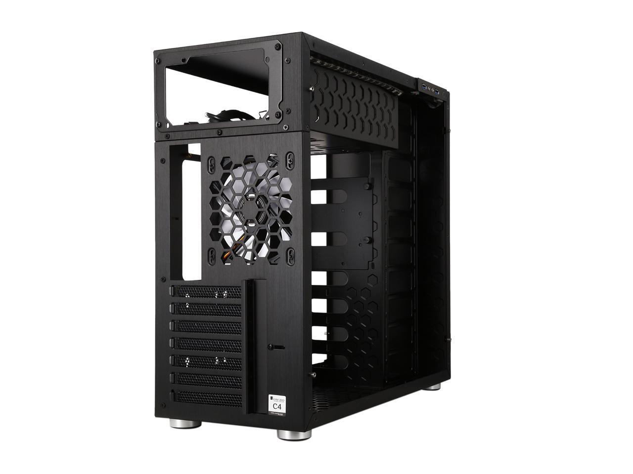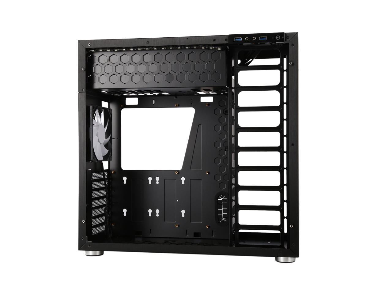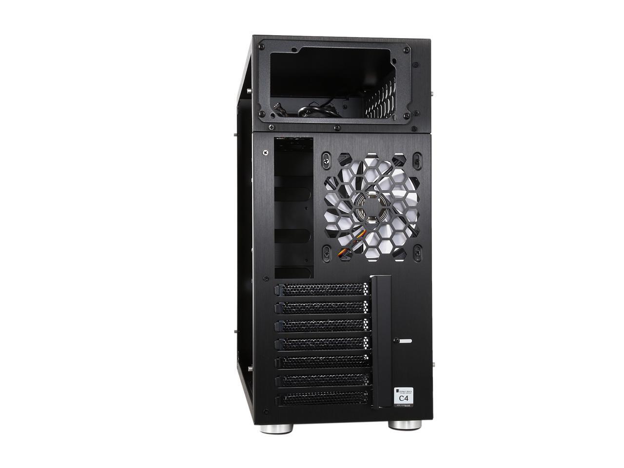 The mid-tower Jonsbo C4 catches eyes at the first sight, featuring clean front panel design, all black interior, and tempered glass panels on both side. Its interior provides adequate space to support ATX motherboard, CPU cooler up to 167mm in height, VGA card up to 300mm long, and up to seven expansion cards. In terms of cooling, the C4 supports three 120mm intake fans at front left side (behind the left glass panel), two 120 intake fans at the bottom, and one 120 rear exhaust fan (included), and features six precision cuts on the right glass panel to ensure advanced air circulation. Water cooling radiator can also be installed. The power button, two USB 3.0 ports and two audio jacks are located at the top of the left panel for easy access, as well as preserving the clean look of the front panel.
