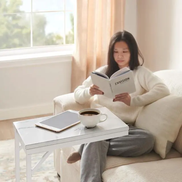 This versatile C-shaped end table is the perfect addition to any living room or small space. Designed to slide seamlessly under your couch, it offers a convenient and space-saving solution for homes, apartments, or studios. The compact size ensures it doesn't crowd your space while still providing a functional surface for your everyday needs. Crafted with a sturdy metal frame and high-quality particleboard, this side table ensures durability and longevity. Whether you're using it as a laptop table, side table for your couch, or even as a snack tray while relaxing on your sofa, this piece serves multiple purposes with ease. The solid construction guarantees that it can hold your essentials, from beverages to laptops, without worry. This end table offers three adjustable height options, allowing you to find the perfect fit for your needs. Customize it to suit your seating arrangement and make the most of your living space. The easy-to-follow instructions ensure quick assembly, so you can start enjoying your new side table right away. Ideal for those who love a multifunctional, space-efficient furniture piece, this C-shaped table is both practical and stylish. Add it to your home for a touch of modern convenience and functionality