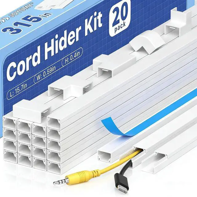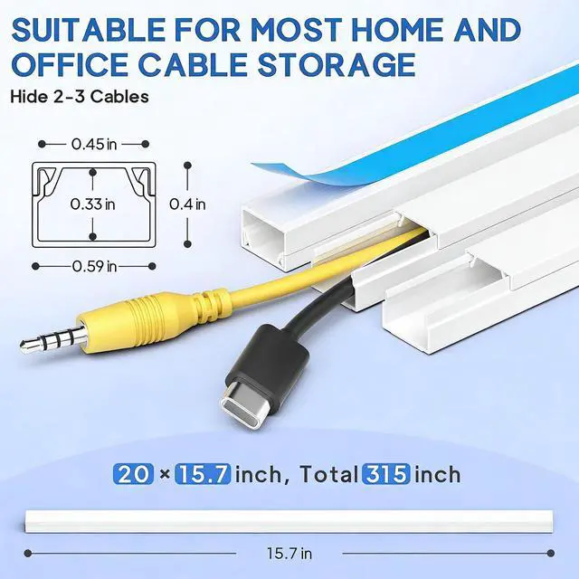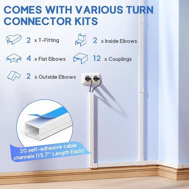 Complete Kit Content: Each cable raceway measures 0.4" inner height × 0.59" inner width × 15.7" length, with a total coverage of 315". The set includes 20 cord hiders, 12 couplings, 4 flat-elbows, 2 T-fittings, 2 inside elbows, 2 outside elbows, and 1 instruction guideeverything you need for full cable concealment.