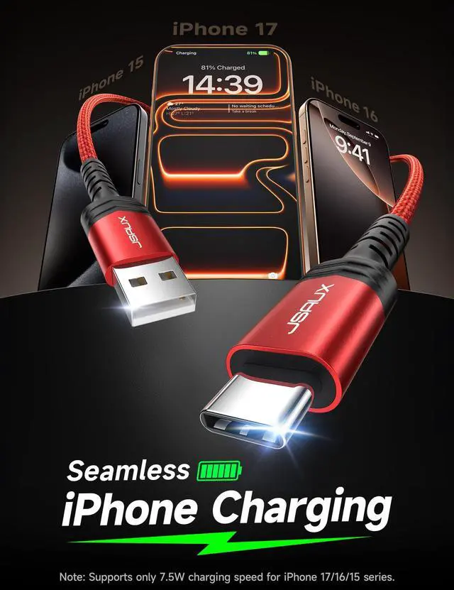 ![Alt view image 7 of 7 - USB C Cable [2-Pack 15ft], USB A to USB Cord Fast Charging for iPhone Air, iPhone 17, iPhone 17 Pro, iPhone 17 Pro Max, iPhone 16/iPhone 15 Series, Samsung S20 S10, Note 20 10, Car Play - Red](https://c1.neweggimages.com/productimage/nb640/C3H4D2512110B65VHB7.jpg)