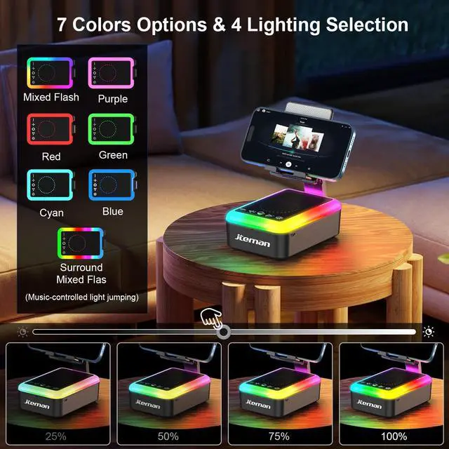 Bluetooth Speaker with LightOur multifunctional Bluetooth speakers with light has 7 colors options, the rhythmic mode can be danced to the beat of the music. 4 kinds of brightness can be adjusted. Turn on the lights while enjoying the music, it's a real party atmosphere! PS: LONG PRESSING THE FIFTH BUTTON 3 SECONDS TO TURN OFF THE LIGHT.