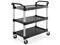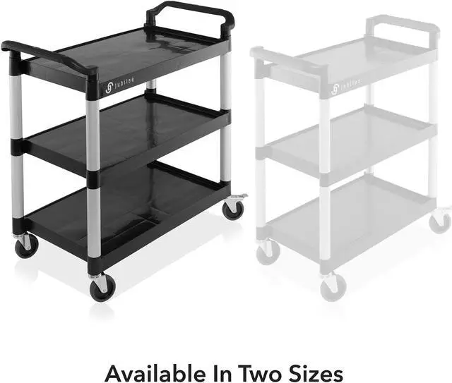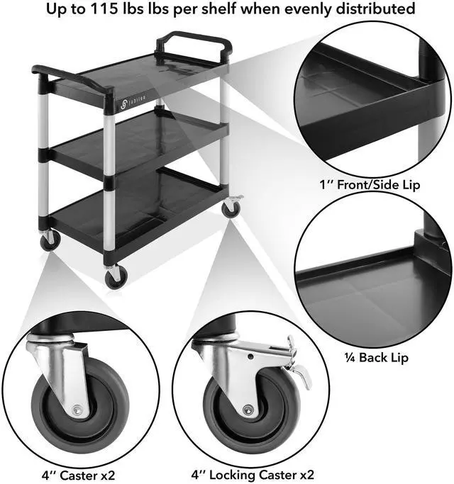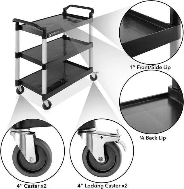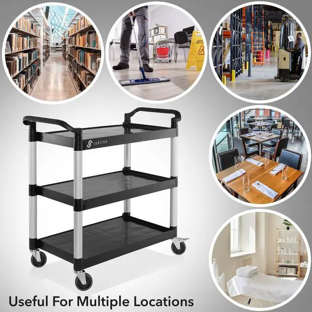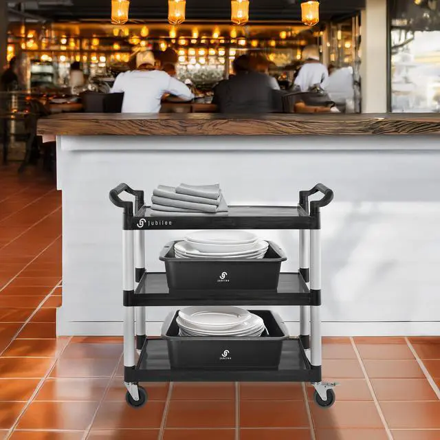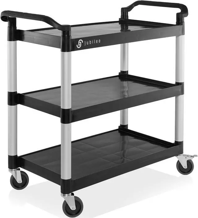 The Jubilee Utility Service Cart is an incredibly versatile tool, able to be utilized in a variety of different settings. Perfect for storing and transporting janitorial supplies, tools, housekeeping supplies, and office supplies, this commercial grade cart is ideal for restaurants, laboratories, beauty salons, and more. It features brushed aluminum uprights and smooth plastic shelves that are 3.6 mm thick, with a 12" clearance between each. It can hold up to 350 lbs., and its large 4" non-marking swivel casters with two wheels with locking brakes make for quiet, easy maneuvers around furniture, corners, and through crowded areas.