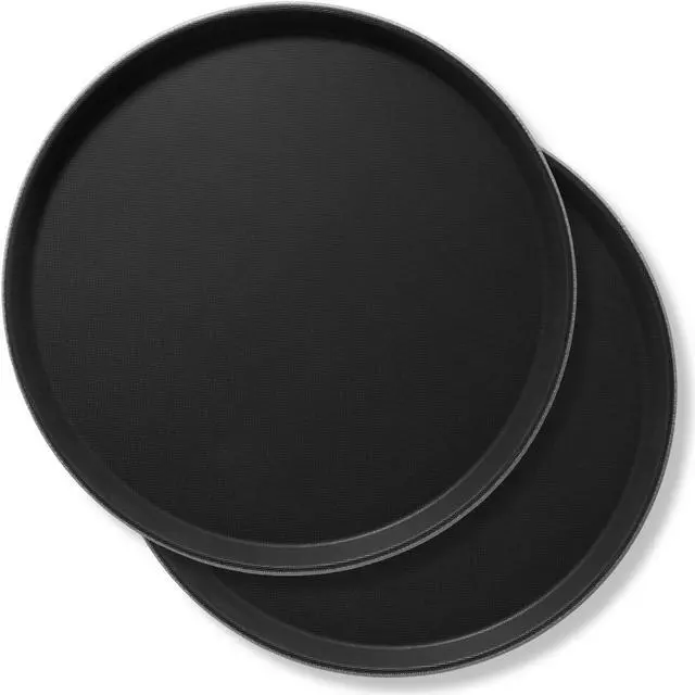 These commercial-grade round serving trays by Jubilee are a must-have for any restaurant, bar, coffee shop, hotel, or catered event. Constructed of heavy-duty, BPA free plastic, these foodservice trays are designed for high-volume use and are built-to-last. The raised edges and non-skid grip surface provide hassle-free transport of drinks, appetizers, entrees, and desserts. Serve with confidence, these restaurant serving trays prevent slipping and spilling while carrying meals from the kitchen to the table.