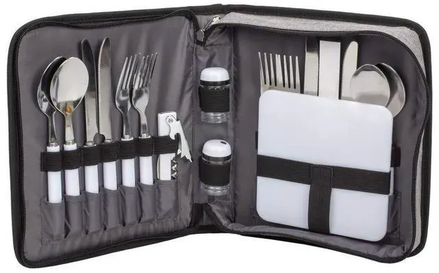Our 18 Piece - 4 Person Travel Picnic/Outdoor Wallet includes 4 x -stainless steel forks, knives and spoons, 2 - salt and pepper shakers, 1 - cheese knife, 1 - cutting board, 1 - bottle opener and zippered wallet case. Enjoy the great outdoors with our easy to carry compact picnic/outdoor set. Case measures 10.2" x 9.1" x 1.8" Made of 600 Denier polyester.