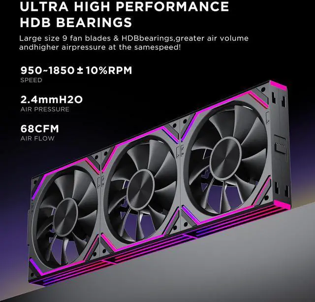 The shape and Angle of the fan blades are designed based on bionics. The large fan blades generate strong wind pressure and large air volume to provide efficient heat dissipation performance. Each fan can provide up to 68CFM.