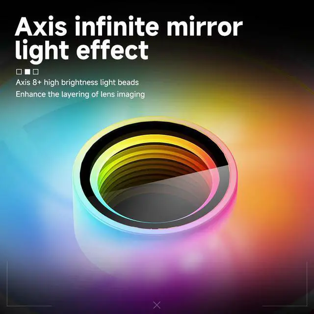 Three sided Infinite Mirror ARGB light effect: Jungle Leopard Prism6 MAX 120mm ARGB PC fan The side infinity mirrors on the left and right sides of the fan are based on infinite geometry. Multiple layers 0.5mm apart are visible in the circular infinity mirror at the center of the fan.