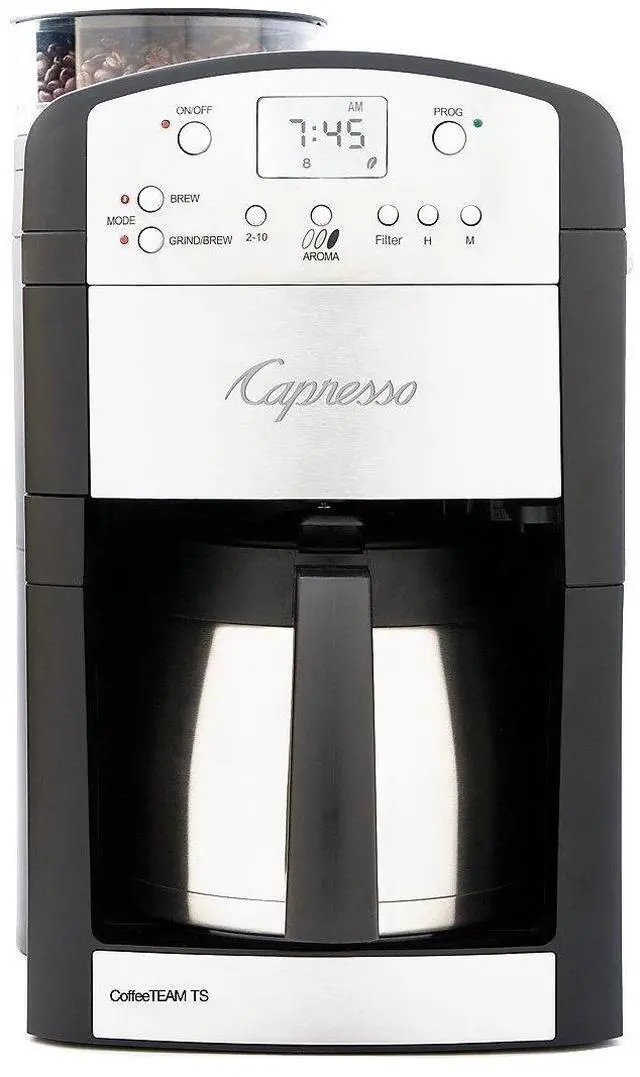 The Capresso CoffeeTEAM TS is a fully programmable 10-cup coffee maker/conical burr grinder combination. Professional, solid-steel conical burrs have 5 grinder settings from coarse to fine for adjustable coffee strength. The slow burr grinding imparts minimal heat, preserving more aroma and flavor. There is a 6-ounce capacity bean container and a see-through window that allows you to check that ground coffee flows smoothly into the filter holder. There is a detachable see-through cover for easy cleaning of the grinder channel. Features The digital control panel has an easy to read illuminated LCD display, programmable clock/timer, 5 programmable brew amounts for 2-10 cups, and 3 programmable coffee strength settings; mild, medium and strong. There are 2 mode settings, grind/brew used for grinding programmed amount of whole beans directly into the gold tone filter, and then automatically starts the brew process, and brew which pushes the filter release button to open the swing out filter holder, add ground coffee without using the grinder. Charcoal water filtration removes up to 82-percent of chlorine and other impurities from tap water. The filter holder and one charcoal filter are included. Coffee brews into 10-cup stainless steel thermal carafe.