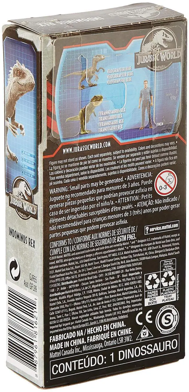 3+. Contents: 1 dinosour. Velociraptor blue. Tyrannosaurus rex. Owen. Figure may not stand as shown. Each sold separately, subject to availability. Colors and decorations may vary. Conforms to ASTM F963. CE listed. www.jurassicworld.com. service.mattel.com. how2recycle.info. Made in China.