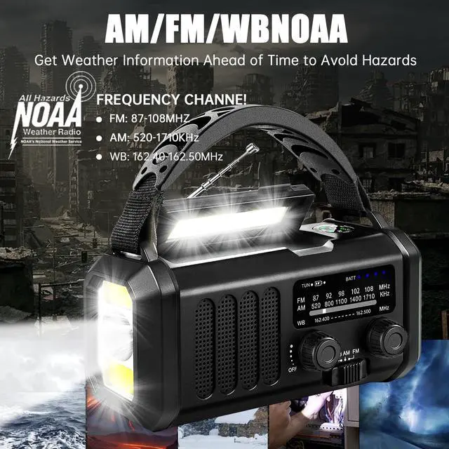 AM FM Solar Radio - Easily listen to your favorite radio programs, including AM radio (520-1710KHz); FM band (87-108MHz); crank radio with comprehensive coverage of entertainment, sports, news or overseas broadcasts,. Telescopic antenna makes it the best portable radio for reception. Large volume knob design is easy to adjust the volume.