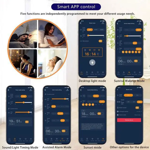 As an invisible clock for organisms, Bioclock can make human physiological, biochemical, and behavioral features demonstrate periodical rhythms within 24 hours. Pineal body (known as the third eye of human body) is the control center of bioclock, being essential to maintain the circadian rhythms of human motions and temperature. Pineal cells produce melatonin because of light, sending time signals to the central nervous system as per melatonin secreted to fulfill the functions of bioclock. Our Sunrise Alarm/Bioclock Adjustment Lamp. They can imitate the natural rising and falling processes of the sun (sunrise/sunset) and preset the automatic light on/off time through programming to effectively regulate human circadian rhythms. Technical Parameters--DC input 5V/2A(USB-C interface--Color TemperatureWarm color temperature 3000K,Cold color temperature 6000K, Mixed color temperature 4500K.--LED life circle: over 50000 hours (Brightness decrease less than 30%)packing list--1* Sunrise Alarm/Bioclock Adjustment Lamp unit--1* USB-A to TYPE-C Cable(Cable length 5 feet)--1* Product instructions