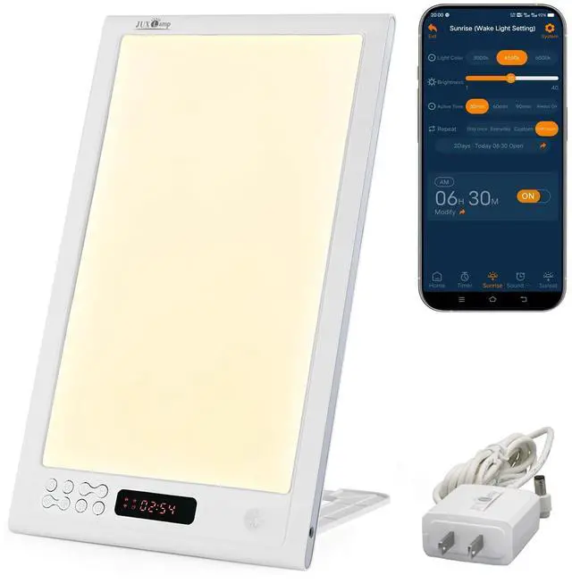 The JUXLamp "Multifunctional Light Therapy Lamp" is an ultra-thin and portable light therapy alarm lamp.