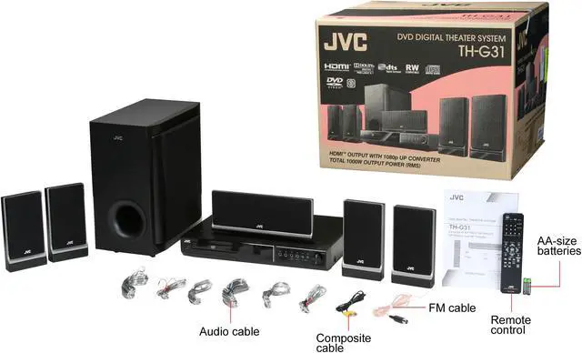 The JVC TH-G31 DVD digital theater system puts you right in the center of the action. A foursome of compact satellite speakers, a center speaker, and a booming subwoofer deliver 1,000 watts of audio power through 5.1 channels, giving you immersive sound.