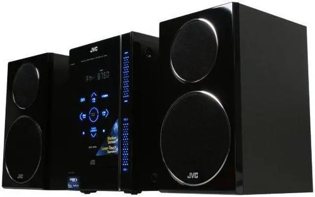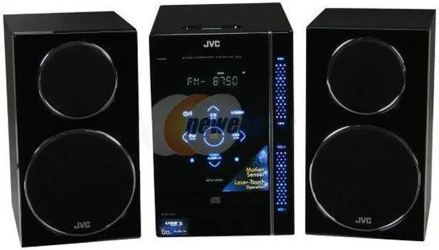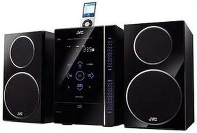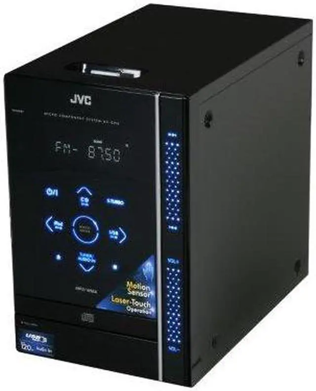 JVC introduces a completely new way to control an audio system. The user "wakes-up' the system from standby mode by waving a hand in front of the system, illuminating all of the controls and the LED display. Another new feature is "laser touch' control of some functions. The system features two laser touch control panels - touch-sensitive illuminated control strips. Running a finger up and down over the strip operates the control. There's one for volume and another that controls the CD player's forward/skip and reverse/skip functions. Other functions are handled using touch panel controls. The system also features a top-mounted iPod dock. A video output allows iPod-stored video to be played through a connected television Other features include USB Host for playback of music files stored on a USB mass storage device, a front audio input for connecting other devices, CD playback and an AM/FM tuner.