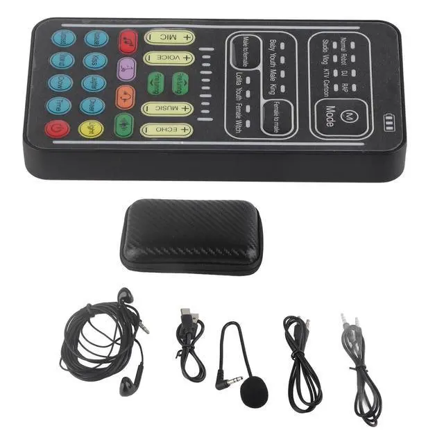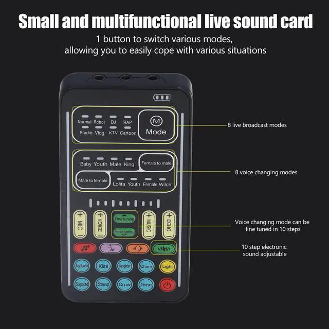 Unleash your creativity with the I9 voice changer set. With 8 voice changes and 8 built-in sound effects, this portable sound card adds excitement to game streaming, recordings, and interactions. It's easy to use, compact, and compatible with a variety of devices. Surprise others with disguised voices or play different characters. This multifunctional voice changer enhances your gaming and entertainment experiences with endless possibilities. Get ready to transform your sound and have fun!