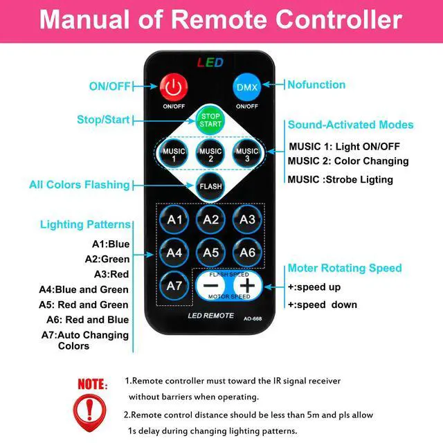 7 lighting modes and sound activated function, create a beautiful colorful lighting effects for your party.