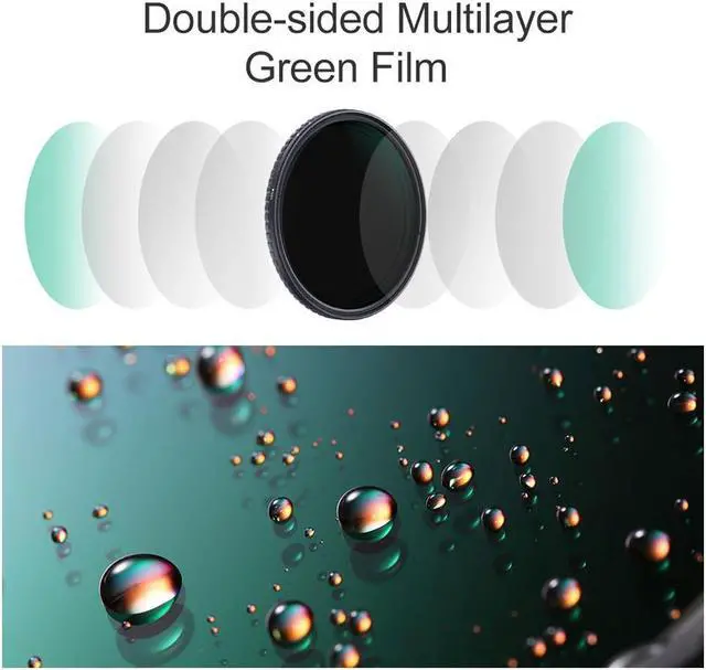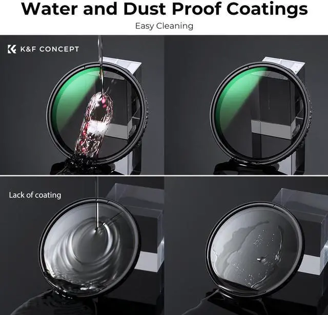 K&F Concept optical engineers developed multi-layer nanometer coatings technology, from the ground up to repel dirt, water, and other elements by beading rather than absorbing and smearing. To withstand extreme wind, dust, and other abrasive conditions and elements.
