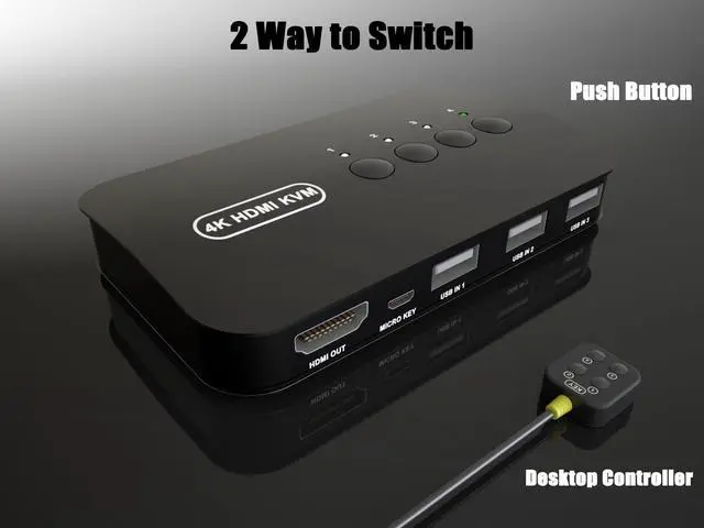 2 ways to switch - desktop controller and faceplate button. you can use the controller or push the button to swaping the pc. the Led lights indicate working computer. usb powered no addtional dc adptor