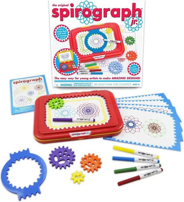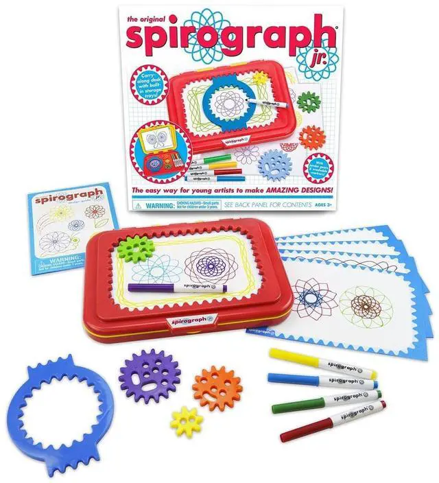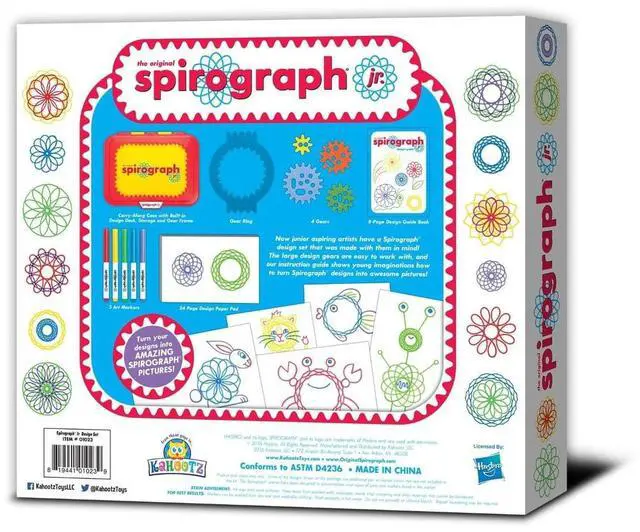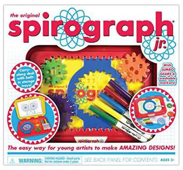 SPIROGRAPH SPIROGRAPH JRCalling all aspiring artists! Now even the youngest creative minds can make amazing designs with the Spirograph Jr. design set! Jumbo-sized pieces make creating Spirograph art fun and easy for little hands, and an easy-to-carry drawing tablet doubles as a work station and handy storage case to keep everything neat. The set includes easy-to-use gears, 5 washable markers, 24 pages of design paper and handy instruction guide. Start their minds spinning with Spirograph Jr.!