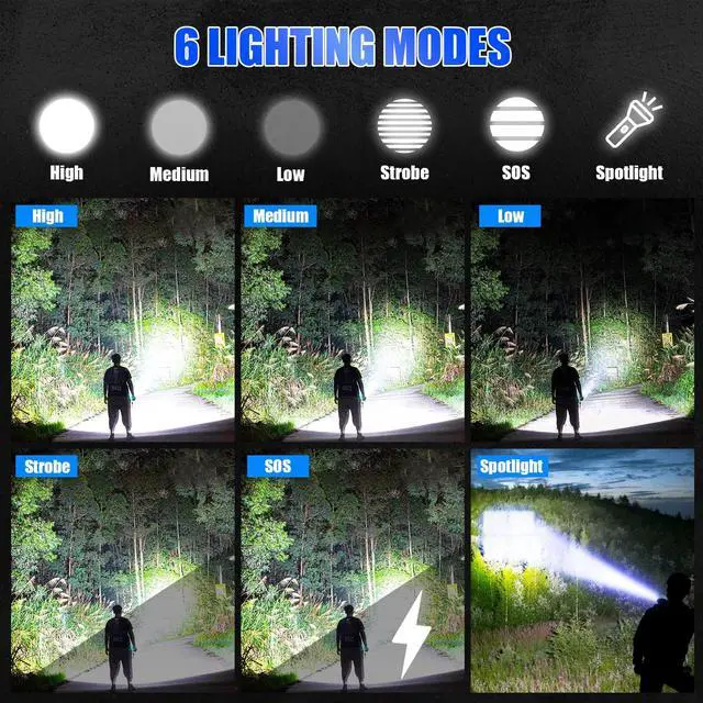 High powered flashlight with a maximum output of 100000 lumens, Irradiation distance up to 1640 ft. Can clearly illuminate over the whole yard.