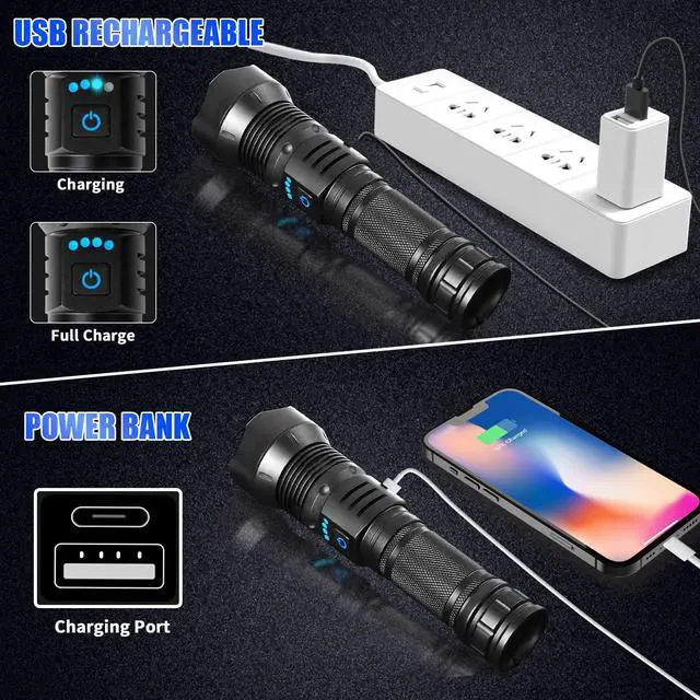Flashlights high lumens built-in 10000mah rechargeable ?attery, use time up to 8-12 hours. Provide overcharge and overdischarge protection.