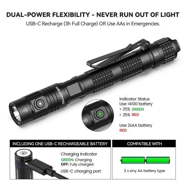 Guardtier M70 Compact EDC Tactical Flashlight - 1500 Lumens, Rechargeable & 2AA Battery Dual-Power, IPX7 Waterproof Pocket Light for Camping, Emergencies, Outdoor Activities