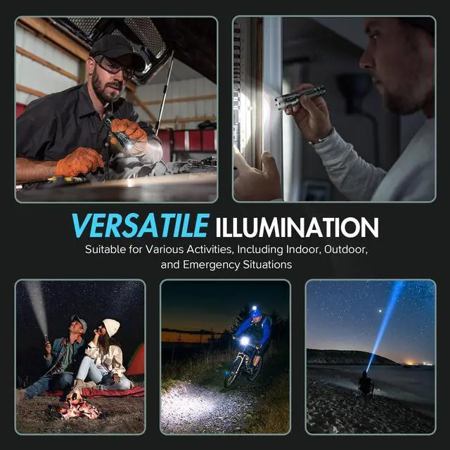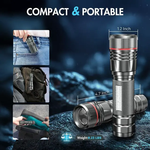 Tactical Compact Flashlights: These small flashlights with 4.7 height and 106g, lightweight enough to carry comfortably and easily fit in your pocket, backpack, purse or car console compartment, ensuring convenient storage and quick access. Keep at home for emergency backup or to use outside, such as dog walking, camping, hiking, fishing, etc