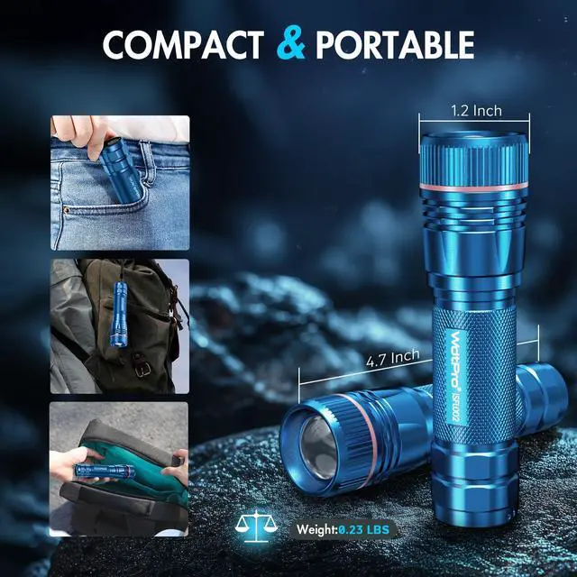 3 Modes Tactical Flashlights High Lumens: WdtPro flashlights high lumens with an upgraded LED chip, produce bright lighting, easily light up an entire room and powerful enough to reach a distance of 300 meters or more. The led flashlights offers 3 lighting choices - high, medium, strobe, specially designed for daily use or emergencies. No need to cycle through so many times to switch among modes. Easily zoom design from a wide flood to a focused, throw-style beam is also a huge plus